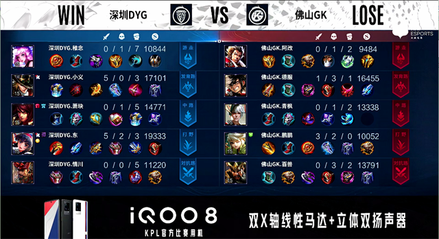 2分29秒,暴君团,双方1换1,深圳DYG拿到暴君。4分05秒,深圳DYG下路越塔击杀狄仁杰。6分12秒,双方两处交火,深圳DYG打出1换3,橘右京拿下双杀。8分26秒,佛山GK破掉深圳DYG上一塔。10分18秒,深圳DYG控下暗影暴君。11分10秒,佛山GK破掉深圳DYG下一塔。11分47秒,深圳DYG控下暗影主宰。12分22秒,深圳DYG三人中路强拆掉佛山GK中一塔。12分50秒,佛山GK大乔传大强拆掉深圳DYG下二塔。14分25秒,河道团,双方1换1,随后深圳DYG破掉佛山GK中、上二塔。14分52秒,深圳DYG控下暗影暴君。15分42秒,佛山GK上路击杀蔡文姬。16分36秒,深圳DYG控下暗影主宰。19分03秒,深圳DYG控下暗影暴君。20分30秒,野区团,深圳DYG击杀狄仁杰,随后破掉佛山GK中、上高地。21分23秒,双方团,深圳DYG击杀廉颇。21分57秒,深圳DYG控下风暴龙王,随后破掉佛山GK下高地。22分50秒,高地团,深圳DYG打出0换4,随后一波推掉佛山GK水晶先下一城。