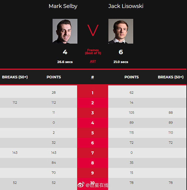 第五局塞尔比两次打进红球但都没有连接进攻,利索夫斯基轰出单杆110分扩大领先优势,第六局塞尔比打出单杆32分出现重大失误,此时台面简单化给对手送上大礼,利索夫斯基上手打出单杆72分拿下这一局,5-1率先拿到赛点。