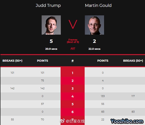 第二局特鲁姆普逐渐找到手感,打出一杆59分,以92-39再下一城2-0领先。第三局两人又陷入防守争夺,特鲁姆普把握住彩球机会,以62-50胜出3-0继续扩大优势。第四局特鲁姆普先上手一杆65分,奥沙利文顶住压力清台逆转,单杆71分后以71-65翻盘取胜,上半场特鲁姆普3-1领先。