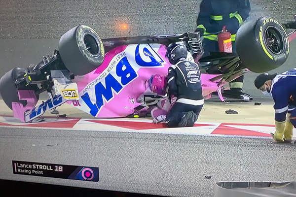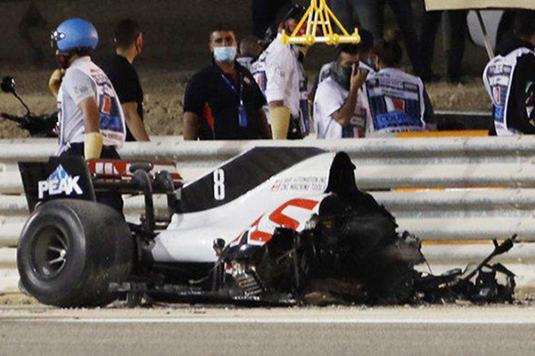 当地时间17:10,在巴林当地的夜色中,巴林大奖赛正式开跑,发车的第一个弯角,博塔斯被身后的四辆赛车超过,刚刚过第一弯,为了超过身前的车阵,格罗斯让向赛道右侧打方向时,不慎碰到身后科威亚特的前鼻翼,赛车直接侧面撞到场边的护墙上,车身在一瞬间引发了大火。