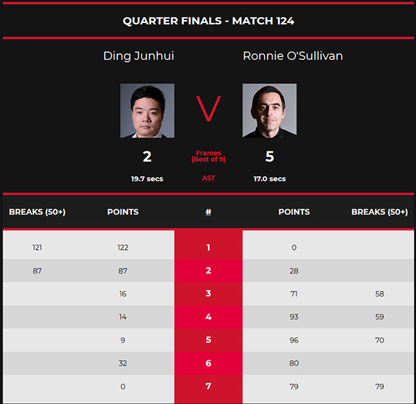 第七局,奥沙利文开杆。一番防守较量后,奥沙利文抓住丁俊晖漏球的机会,长台打进右侧底袋红球上手,单杆79分一杆制胜,以79-0零封对手,连胜5局,大比分5-2逆转晋级4强。他将与卡特在半决赛中相遇。