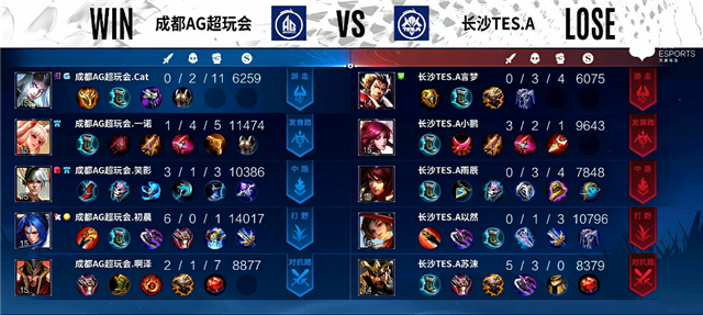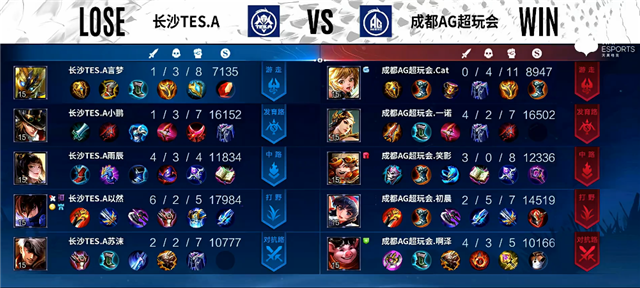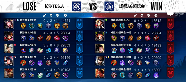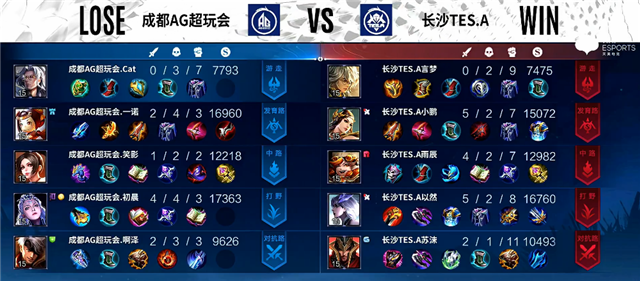 4分钟上路交火,蒙恬拿下一血,双方1换1。3分30秒云缨拿下暴君,橘右京拿下主宰。4分20秒下路团战,长沙TES.A打出1换3。5分钟伽罗推掉下路一塔。6分钟伽罗推掉上路一塔。7分50秒橘右京拿下主宰。8分20秒云缨拿下暴君,公孙离被击杀。10分20秒云缨拿下主宰。10分37秒暴君团,成都AG超玩会打出0换2,嬴政推掉中路一塔。11分37秒橘右京拿下暴君。12分20秒野区团战,成都AG超玩会打出1换2。12分37秒高地团战,双方1换1。14分钟橘右京拿下主宰。15分20秒成都AG超玩会推掉中下两路高地塔。16分04秒成都AG超玩会推掉水晶拿下本场比赛胜利。