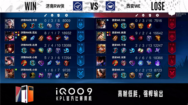 2分10秒,济南RW侠控下先知主宰。3分48秒,济南RW侠团战打出0换2。4分16秒,西安WE破掉济南RW侠上一塔。4分45秒,济南RW侠控下暴君。5分21秒,济南RW侠镜下路单杀娜可露露。5分49秒,济南RW侠蒙恬下路越塔击杀吕布。6分20秒,济南RW侠破掉西安WE上一塔。8分07秒,济南RW侠破掉西安WE下二塔。8分36秒,双方团战1换1。10分钟,济南RW侠中路越塔击杀太乙真人,随后破掉西安WE中一塔。10分34秒,济南RW侠破掉西安WE中二塔,随后镜控下暗影主宰。10分55秒,济南RW侠破掉西安WE上高地,西安WE击杀姜子牙。11分55秒,济南RW侠击杀太乙真人。13分04秒,济南RW侠控下暗影暴君。13分30秒,双方团,济南RW侠打出0换4,镜拿下三杀。13分47秒,济南RW侠下路一波摧毁西安WE水晶再下一城。