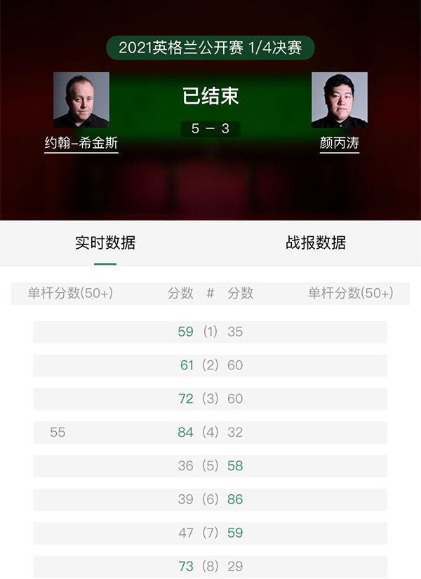 综合直播斯诺克 2021斯诺克英格兰公开赛1/4决赛 希金斯vs颜丙涛 全场录像回放