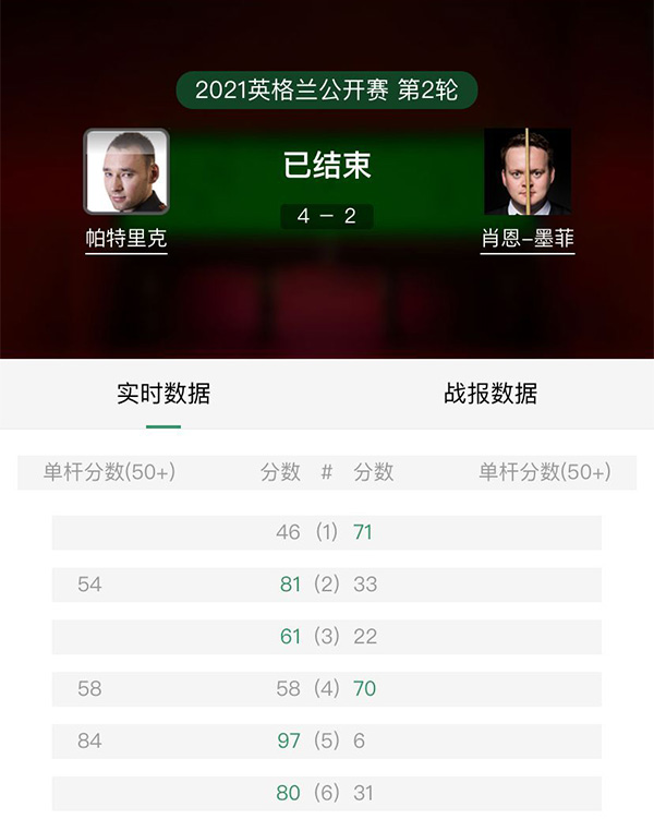 在墨菲和帕特里克的比赛中,墨菲的状态可谓非常低迷。在首局比赛中,墨菲凭借出色把握机会的能力以71:46拿下此局取得1-0的领先。第二局,帕特里克单杆轰出54分并以81:33拿下此局比赛以1-1战平墨菲。第三局,帕特里克61:22拿下此局比赛的胜利以2-1反超墨菲取得领先。第四局,虽然帕特里克单杆打出了58分的表现,但是墨菲还是凭借出色把握机会的能力以70:58拿下此局比赛的胜利以2-2战平帕特里克。第五局,帕特里克单杆轰出84分以97:6拿下此局比赛的胜利以3-2领先墨菲成功拿到赛点。第六局,帕特里克80:31拿下此局从而4-2爆冷击败墨菲晋级。