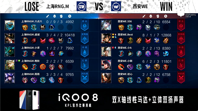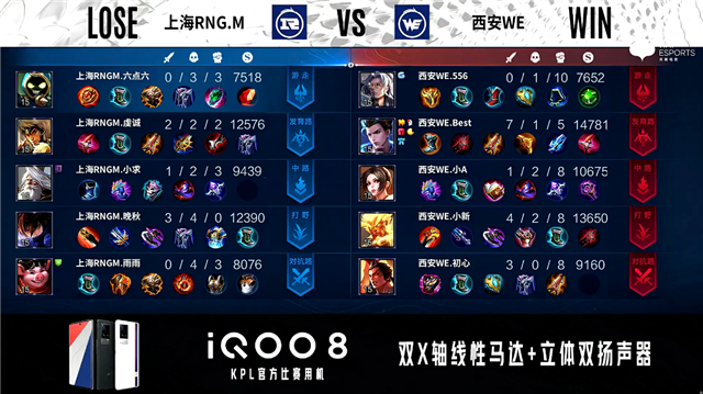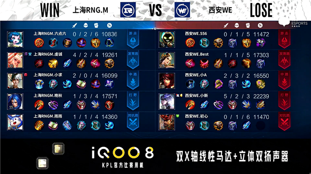 双方常规开局。2分13秒上海RNG.M中路击杀嬴政拿到一血。3分06秒西安WE发育路击杀盾山。3分44秒西安WE拿下主宰。3分56秒西安WE对抗路击杀阿古朵。4分07秒西安WE发育路击杀盾山。5分06秒中路团西安WE打出1换2。5分33秒西安WE摧毁敌方中路外塔。5分51秒西安WE拿下暴君。6分28秒西安WE对抗路打出0换3。6分52秒西安WE摧毁敌方中路二塔。7分18秒西安WE发育路打出0换2。7分40秒西安WE摧毁敌方发育路高地塔。8分03秒西安WE拿下主宰。8分36秒西安WE击杀盾山并摧毁敌方对抗路高地塔。10分23秒西安WE野区击杀马超。10分37秒西安WE拿下暗影暴君。11分06秒中路团战上海RNG.M打出1换3。12分51秒西安WE野区击杀盾山。13分21秒西安WE摧毁敌方中路高地塔。13分51秒西安WE强点敌方水晶拿下比赛。