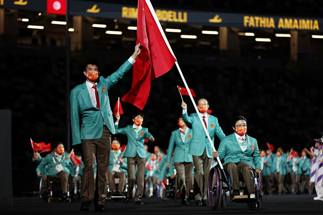 在开幕式第一段表演结束后,运动员入场式正式开始。身穿淡绿色西装礼服的中国代表团,在双旗手——女子轮椅射箭运动员周佳敏和男子肢残田径运动员王浩的引领下,按照日语首字母顺序,排在第98位入场。
