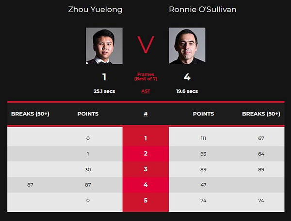 第四局,周跃龙长台不进,奥沙利文单杆47分失误;周跃龙单杆89分清台追回一局。第五局,奥沙利文打带防上手,奥沙利文在6分的时候,进攻红球校位出现失误,结果母球两次撞红球之后,校到了粉球,最终奥沙利文单杆74分拿下比赛!