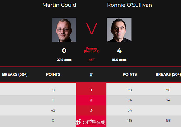 第一局,古尔德单杆11分,粉球失误;奥沙利文单杆70分超分;古尔德继续追分,单杆8分,红球不进留袋口;奥沙利文单杆8分拿下第一局。第二局,古尔德打进红球,黑球失误;奥沙利文单杆74分拿下。奥沙利文2-0领先。