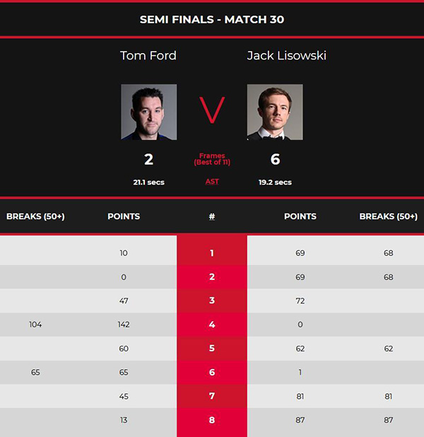 比赛中利索夫斯基没有受到此前7连败的影响,前两局,利索夫斯基率先进入状态,连续打出了两杆68分、69-10和69-0连赢两局。第三局,福德又出现失误,利索夫斯基抓住机会,多杆上手,72-47再下一城。第四局,福德爆发,轰出了单杆104分、142-0零封。在上半场,利索夫斯基3-1领先。