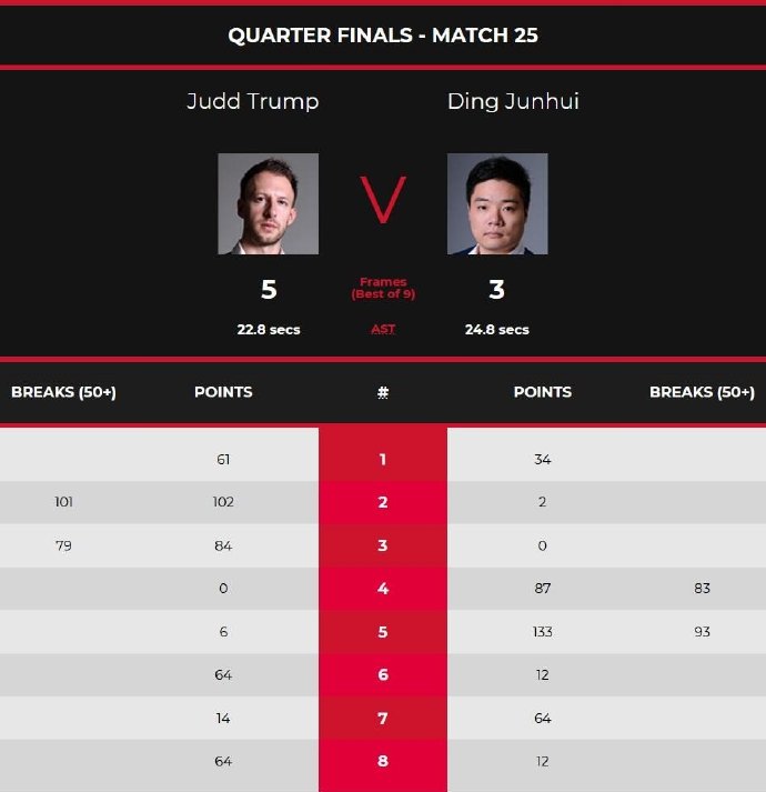 第七局,特鲁姆普率先拼进远台红球成功上手在拿到14分后击打红球出现失误。随后丁俊晖打进左侧中袋红球成功获得上手机会,在拿到33分后击打咖啡球出现失误。随后特鲁姆普进攻右侧底袋红球出现失误,丁俊晖拼进右侧底袋红球再次上手,在拿到16分选择贴绿球防守。随后特鲁姆普防守出现失误,丁俊晖打进红球成功上手,最终丁俊晖64:14拿下此局比赛的胜利从而以3-4落后特鲁姆普。第八局,特鲁姆普率先拿到1分后叫位不佳被迫选择防守,丁俊晖防守失误,特鲁姆普打进拼进远台红球成功上手,在拿到6分后出现失误。随后丁俊晖防守出现失误,特鲁姆普扎杆打进右侧中袋红球获得上手机会,再拿到43分后出现失误。丁俊晖打进红球上手拿到12分失误。最终特鲁姆普以64:12拿下比赛胜利以5-3击败丁俊晖进四强。