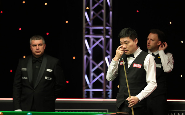 24直播网1月30日讯 2021年斯诺克德国大师赛1/4决赛争夺,丁俊晖对阵世界排名第一的卫冕冠军特鲁姆普。丁俊晖在开局连输三局后,打出单杆83分和93分追至2-3,并追回一个赛点,但最终还是以3-5的总比分不敌特鲁姆普无缘四强。