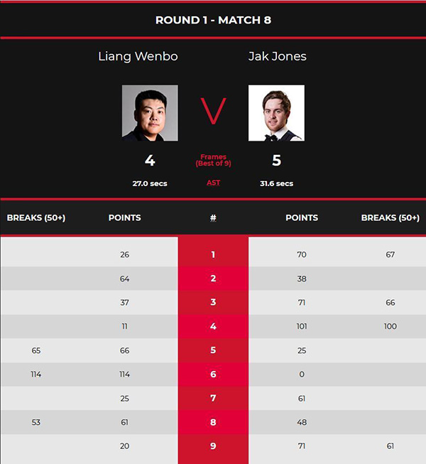 最后时刻,杰克·琼斯率先找到突破口,一杆61分确立领先优势,梁文博拼尽全力,但手感确实很一般,20-71输掉决胜局,大比分4-5不敌杰克·琼斯,惨遭一轮游。
