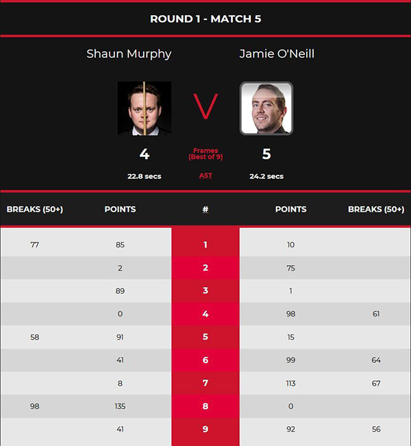 第一局,墨菲率先进入状态,打出了单杆77分、85-10先下一城。第二局,墨菲状态低迷,奥尼尔多杆上手,75-2大胜,大分1-1扳平。第三局,墨菲还以颜色,89-1大胜,2-1再次超出。第四局,奥尼尔打出单杆61分、98-0零封墨菲,2-2进入到中场休息。