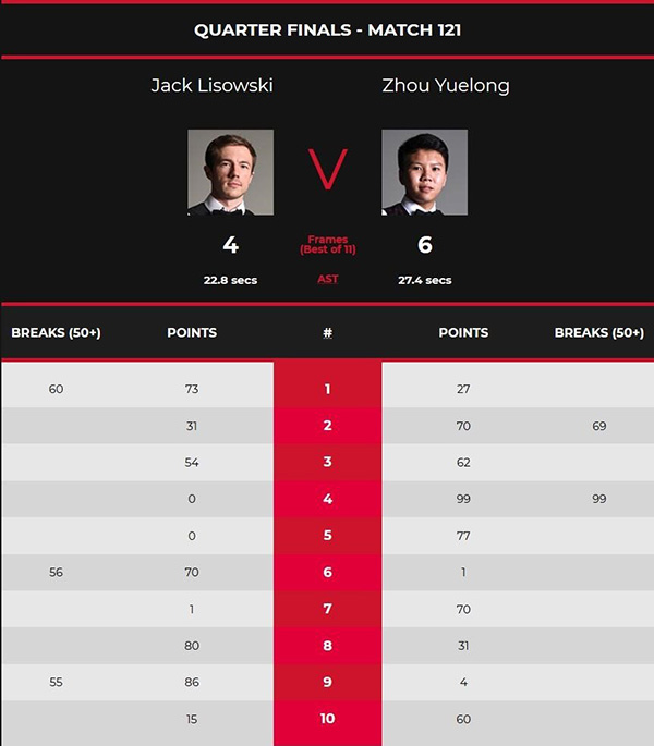 第八局,周跃龙本有机会拿下,但最后一颗红球叫位黑球打丢,利索夫斯基以80-31追上一局。第九局,利索夫斯基单杆得到55分,以86-4连追2个赛点。第十局,周跃龙终于把握住局面,一杆中远台上手完成超分,以60-15拿下比赛,总比分6-4有惊无险获胜,职业生涯首次打进三大赛四强,也是第四次跻身排名赛半决赛。