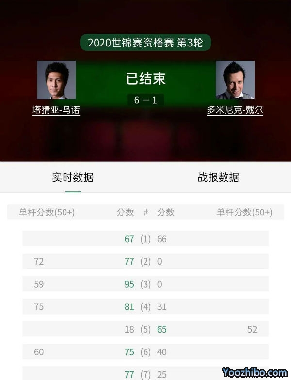 - 【录像】[虎牙视频]2020斯诺克世锦赛资格赛 塔猜亚-乌诺vs多米尼克-戴尔 上半场录像回放2020-07-27 19:50:10