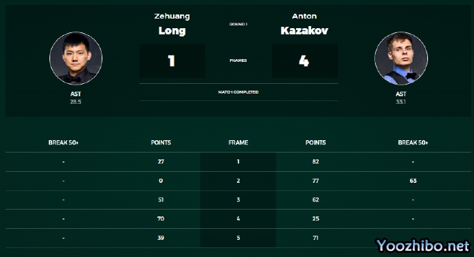 在龙泽煌和卡扎科夫的比赛中,龙泽煌的状态可谓是非常低迷,他甚至在比赛中出现了很多的失误。在首局比赛中,卡扎科夫凭借多次上手的机会拿到了82分并以82-27拿下此局比赛的胜利从而以1-0领先龙泽煌拔得头筹。