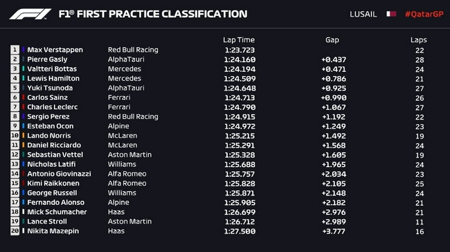 最终在一练中,维斯塔潘以1:23.723的最快圈速排名第一,加斯利落后0.437秒排名第二,博塔斯落后0.471秒排名第三。汉密尔顿和角田裕毅分列四五,排名六至十位的车手分别是塞恩斯、勒克莱尔、佩雷兹、奥康、诺里斯。