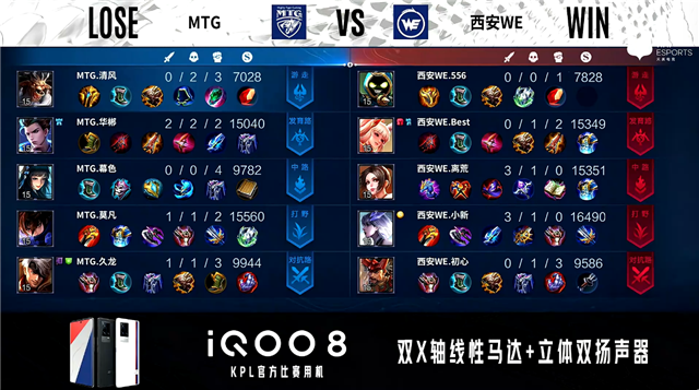 开局44秒西安WE沈梦溪入侵野区击杀镜拿得到一血,随后MTG击杀沈梦溪。2分06秒MTG野区击杀橘右京。2分15秒MTG拿下暴君。3分53秒发育路团战双方1换1。5分30秒MTG对抗路击杀沈梦溪。5分49秒西安WE拿下主宰。6分57秒MTG拿下暴君。7分56秒发育路团战西安WE打出0换2。9分34秒对抗路团战双方1换1。11分30秒西安WE拿下暗影暴君。11分39秒MTG拿下暗影主宰。14分38秒中路团战西安WE击杀镜。16分23秒MTG拿下暗影主宰,西安WE拿下暗影暴君。18分19秒西安WE对抗路击杀镜。18分49秒西安WE强点敌方水晶拿下比赛。
