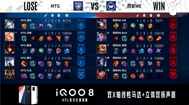 2分31秒MTG发育路击杀成吉思汗拿到一血。6分56秒发育路团战西安WE打出2换3。12分31秒MTG拿下主宰。13分13秒MTG摧毁敌方发育路二塔。13分22秒MTG摧毁敌方中路外塔。14分43秒MTG摧毁敌方对抗路二塔。15分44秒对抗路团战双方1换1。21分41秒野区团战MTG打出0换5,沈梦溪拿到三连决胜。22分07秒MTG摧毁敌方水晶拿下比赛。