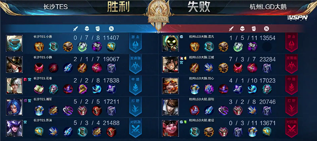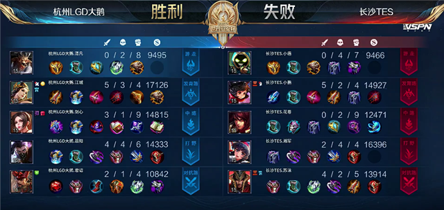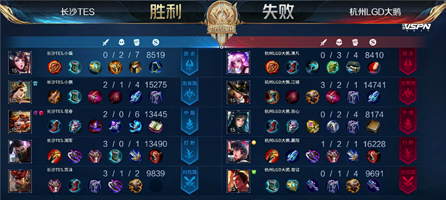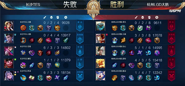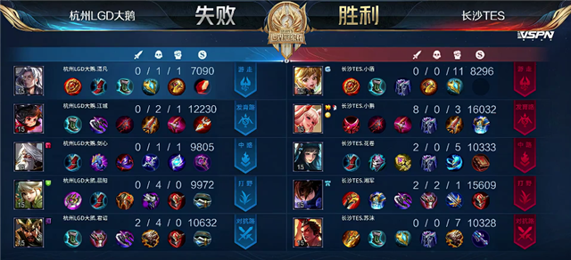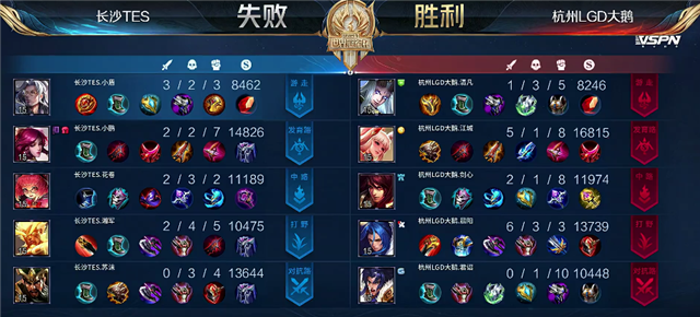 双方平稳开局。2分23秒吕布拿下暴君。4分18秒关羽拿下一血。5分33秒澜单杀关羽。5分55秒澜拿下主宰。7分10秒李元芳拿下暴君。8分钟公孙离推掉上路一塔。8分39秒孙膑推掉中路一塔。9分20秒野区团战,阿古朵被击杀。10分39秒澜拿下暴君。11分50秒长沙TES推掉中路二塔。12分44秒澜被关羽击杀。13分钟中路团战,长沙TES团灭杭州LGD大鹅,公孙离拿下两个双杀。长沙TES顺势推掉中路防御塔。14分57秒澜拿下暴君。16分18秒关羽被击杀。16分30秒阿古朵被击杀。17分54秒澜拿下暴君。19分钟暴君团,长沙TES打出0换3,公孙离拿下双杀。19分55秒长沙TES推掉水晶再拿一分。