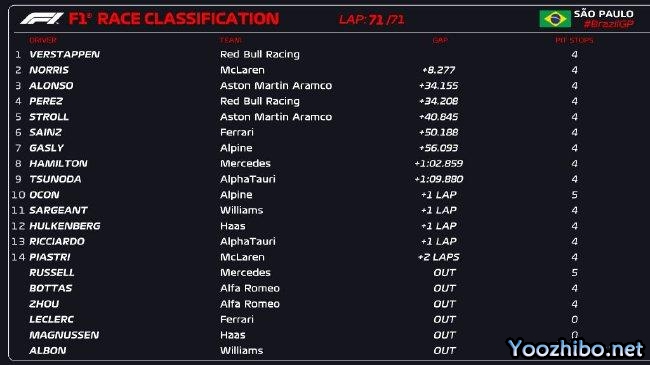24直播网讯 北京时间11月6日,2023F1圣保罗站大奖赛正赛于北京时间今日凌晨1点在若泽-卡洛斯-帕塞赛道上演。维斯塔潘再次锁定冠军,诺里斯、阿隆索分列二、三名。而法拉利车队的勒克莱尔则在暖胎圈撞墙退赛。斯托尔、塞恩斯、加斯利、汉密尔顿、角田裕毅、奥康分列五至十位。勒克莱尔和周冠宇遗憾退赛。