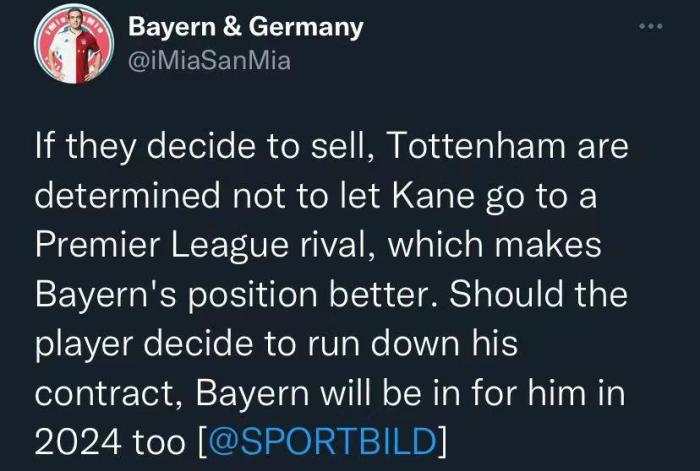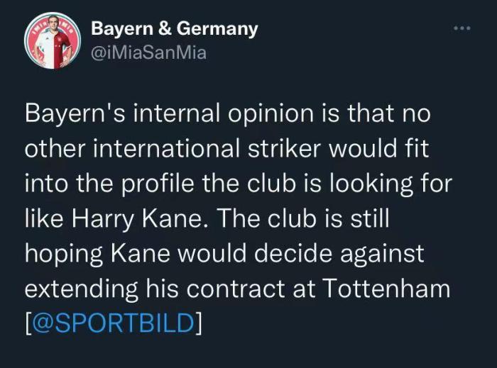 该媒体表示,拜仁方面认为除了凯恩外没有其他适合球队的中锋,凯恩是唯一且最佳的人选,因此他们希望凯恩不与热刺续约。