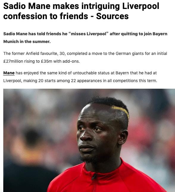 据悉,马内在慕尼黑的生活并不适应。转会离队才4个月,马内便已经在私下场合向朋友承认:“我非常想念利物浦,想念英超联赛。”