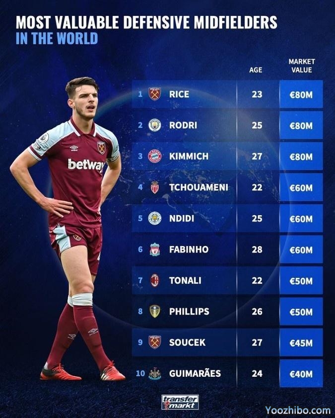 24直播网06月17日讯 ,德转更新球员身价,并列出防守型中场身价榜,其中赖斯等人8000万欧并列榜首。