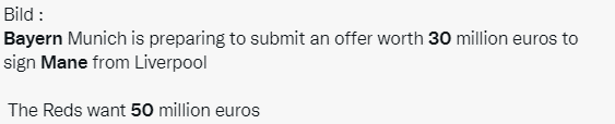 24直播网05月26日讯 据《图片报》报道,拜仁准备3000万欧元报价马内,但利物浦希望得到5000万欧元。