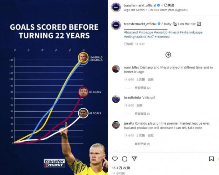 24直播网05月14日讯 在22岁前,哈兰德打进了134球,姆巴佩打进了130球,远高于同期的梅西(80球),而C罗22岁前只打进了47球。