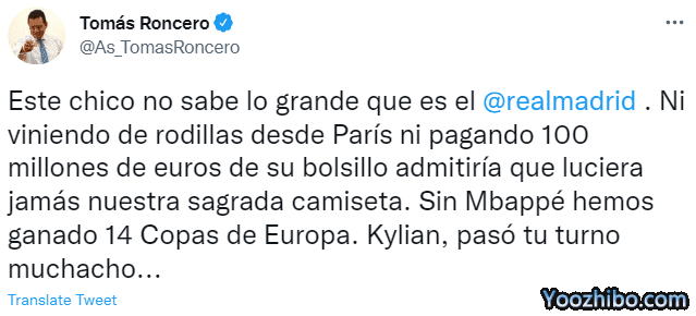 龙赛罗在其推特上写道:“这孩子不知道皇家马德里意味着什么,无论是跪着从巴黎来到马德里,还是自掏腰包拿出1亿欧元,都不能让他穿上我们神圣的球衣。”