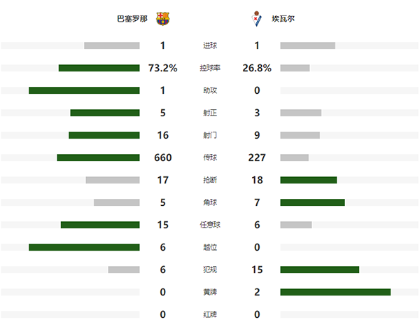 第56分钟,埃瓦尔打破场上僵局!阿劳霍中场控球失误被抢断,基科-加西亚单刀持球杀入禁区面对出击的特尔施特根冷静推射破网,埃瓦尔1-0领先巴萨。