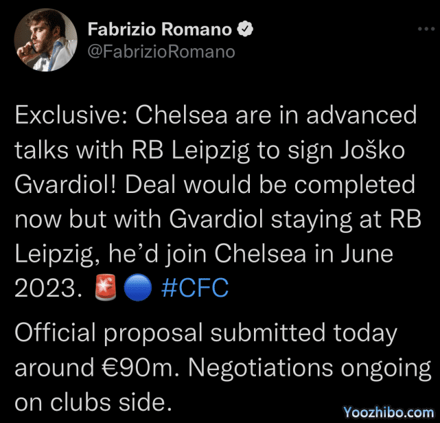 来源:24直播网08-31 20:2324直播网08月31日讯 凌晨,来自意大利天空体育著名记者Fabrizio Romano的独家报道,切尔西正在就克罗地亚国脚中卫格瓦迪奥尔的交易,和莱比锡红牛队进行深入谈判。