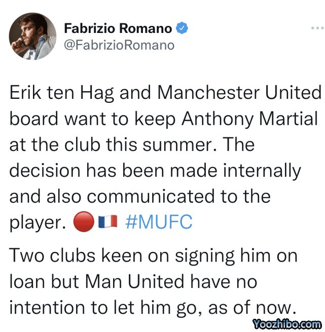 来源:24直播网07-23 11:1824直播网07月23日讯 凌晨,来自知名转会专家罗马诺的消息,曼联主帅滕哈格和俱乐部高层在内部沟通后,已经决定并通知法国射手马夏尔,新赛季他将会留在曼联。罗马诺透露,有两家俱乐部有意租借马夏尔,但目前曼联无意让他离开。
