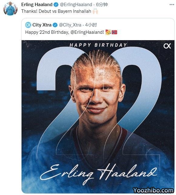 比赛结束后,哈兰德转发了球迷祝贺他生日快乐的推文,并表示自己会在对阵拜仁的比赛中完成首秀。