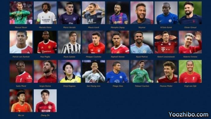 莫拉塔、亚尔莫连科、伊尔马兹、法布雷加斯、因莫比莱、德赫亚、哲科、爱德华-门迪、贝尔、基耶利尼、凯恩、佩里西奇、若日尼奥、夸德拉多、马塔、伊东纯也、库利巴利、本泽马、德布劳内、纳瓦斯、李青龙、博努奇、梅西、苏亚雷斯、诺伊尔、马塞洛、维拉蒂、伊卡尔迪、德佩、内马尔、坎特、吉鲁、范安霍尔特、博格巴、迪巴拉、库蒂尼奥、瓦拉内、马赫雷斯、莱万、菲尔米诺、马内、拉莫斯、香川真司、孙兴慜、蒂亚戈-席尔瓦、库尔图瓦、穆勒、范迪克、武磊、郑智