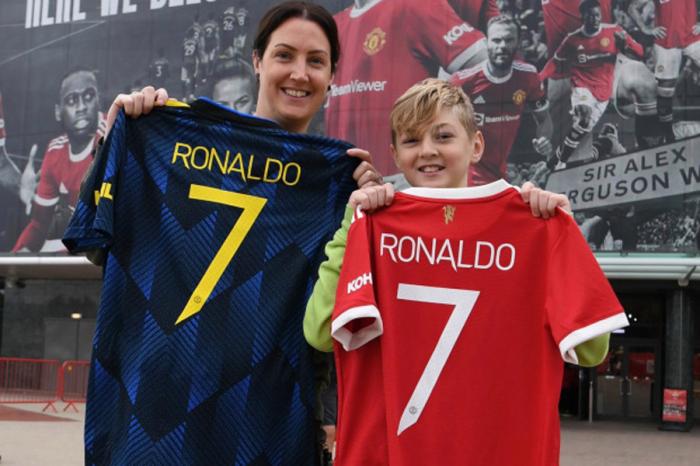 因此,顺利买到C罗战袍的女球迷斯麦林·沙普尔斯和儿子伊森,眉开眼笑地向英媒展示了他们手中的C罗球衣。