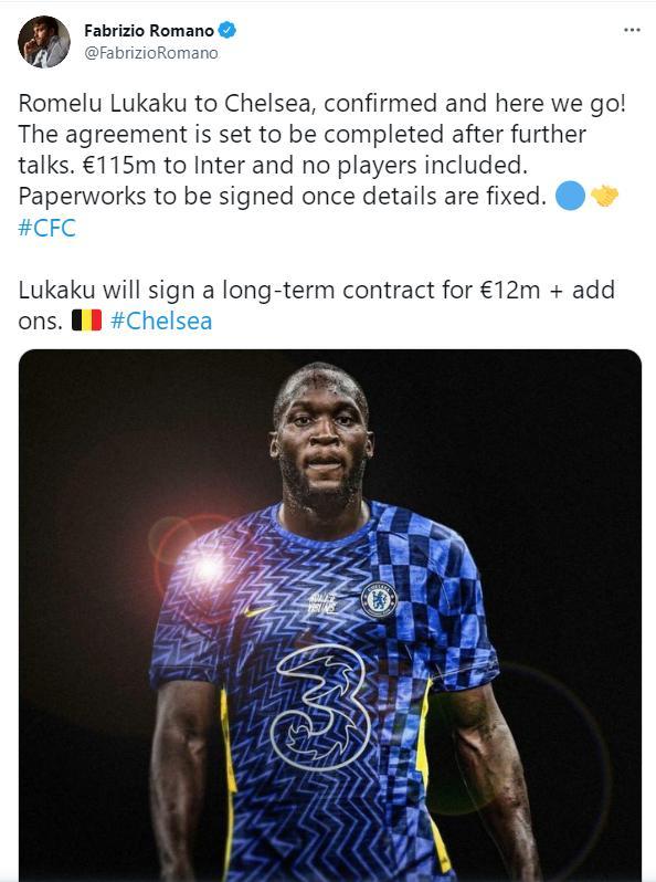 罗马诺在个人推特上写道:“卢卡库确认加盟切尔西。在进一步的谈判后,双方将达成协议。切尔西将支付国米1.15亿欧转会费,没有球员加入交易。细节谈妥后,将签署相关文件。卢卡库将签下一份长期合同,年薪1200万欧元,还有奖金。”