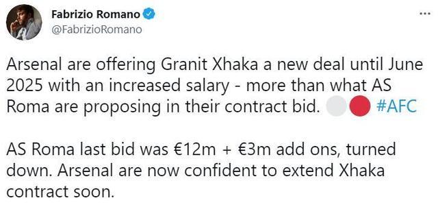 罗马诺表示,阿森纳已经为扎卡开出了一份4年的续约合同,薪资高于罗马开出的数字。